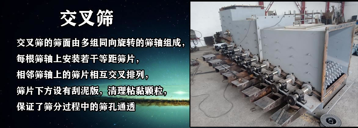 【產品介紹】:交叉篩的篩面由多組同向旋轉的篩軸組成,每根篩軸上安裝若干等距篩片,相鄰篩軸上的篩片相互交叉排列,篩片下方設有刮泥版,清理粘黏顆粒,保證了篩分過程中的篩孔通透